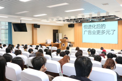 院长彭军辉主持讲座,他回顾了365英国上市集团的建院历史,并对广告专业进行展望,他表示:“这场讲座有利于我们广告学的同学们建立对这个专业的信心。”365英国上市集团2022、2023级约一百位学生听取了讲座。