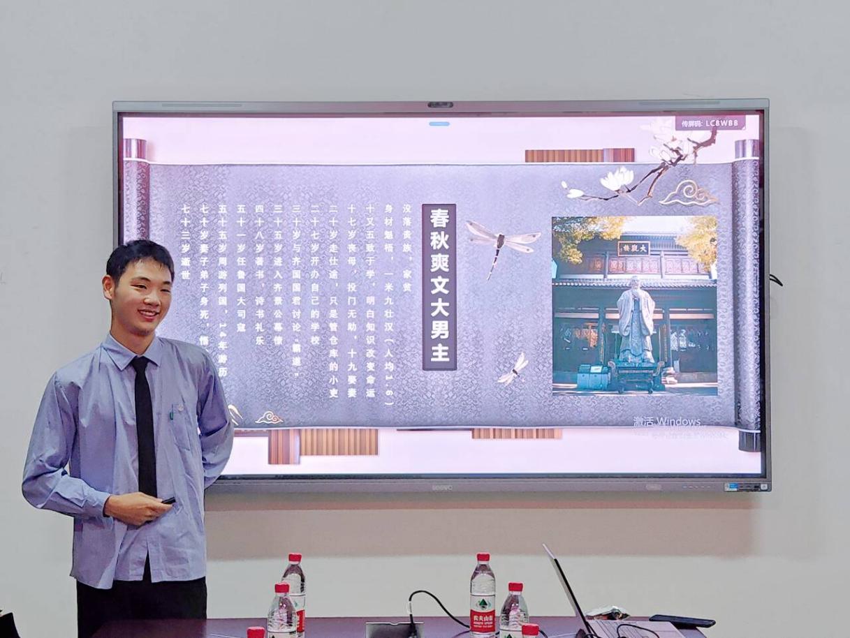 分享会现场,参赛选手依次上台进行介绍,《围城》《平凡的世界》《哈姆莱特》《故事新编》《论语》《活着》六本书为参赛选手的参赛书目。其中,参赛选手高琪从《哈姆莱特》的基本信息和核心内容出发,围绕人文主义精神,结合原著的经典命题及关键情节,对当下年轻人的生存实践展开分析,同时进行对书本的深度解读,语言条理清晰,以第一名的成绩荣获一等奖。