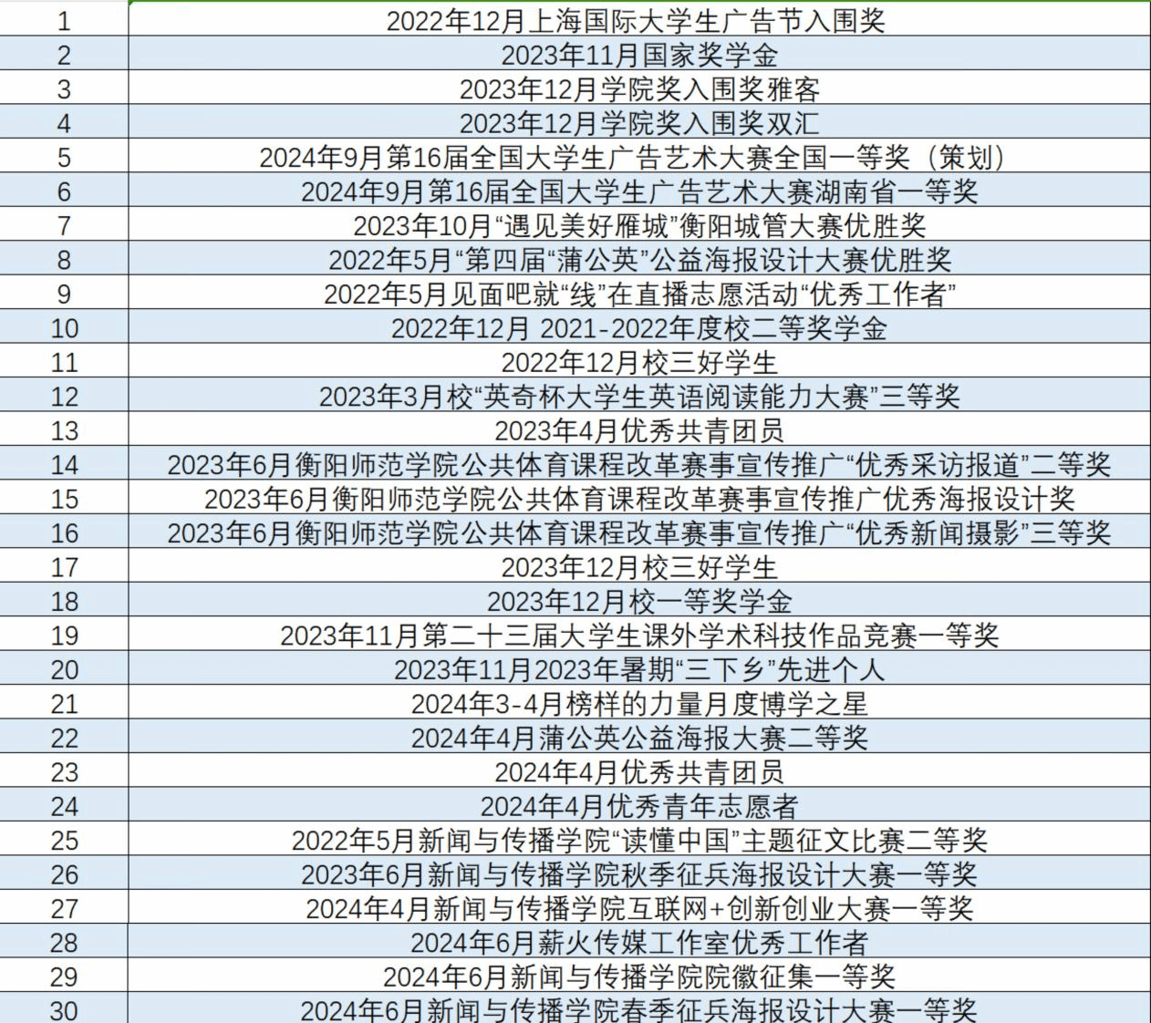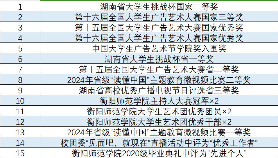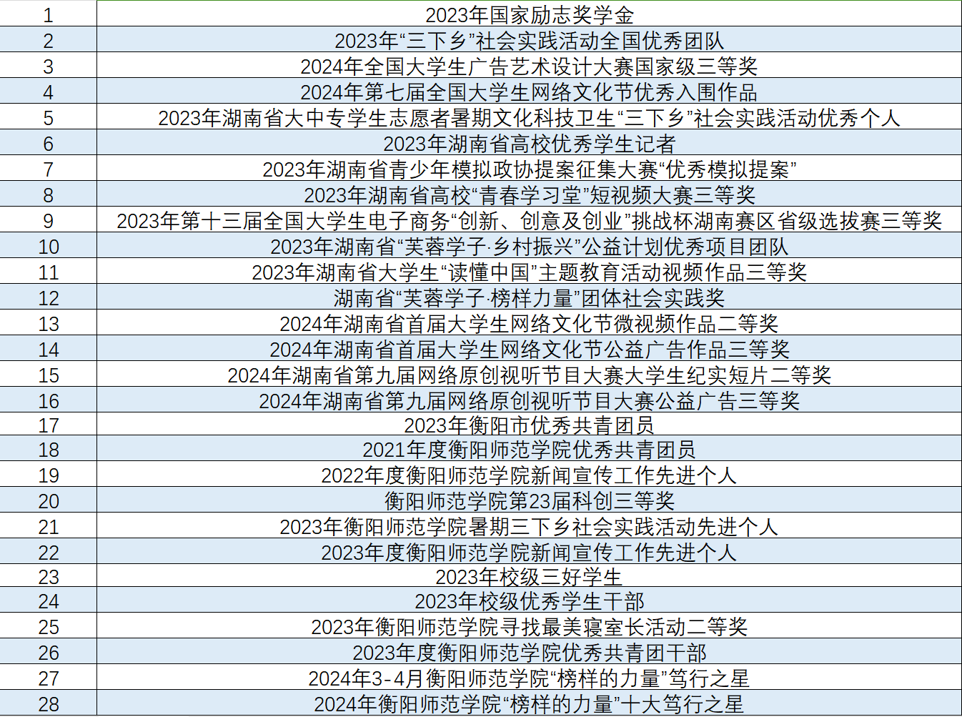 在校期间,她夯实学业,砥砺前行,累计获得国家级、省级荣誉17项、院级及以上荣誉37项。连续三年综合测评位列全班前五,曾获国家励志奖学金,校二等奖学金;将理论落地实践,积极参与各项学科竞赛,曾获第七届全国大学生网络文化节国家级优秀入围作品、全国大学生广告艺术设计大赛国家三等奖、湖南省第九届网络原创视听节目大赛省级二等奖等。个人曾获评“湖南省高校优秀学生记者”、“湖南省三下乡优秀个人”“衡阳市优秀共青团员”、校级“新闻宣传先进个人”、校级“优秀学生干部”等荣誉称号。