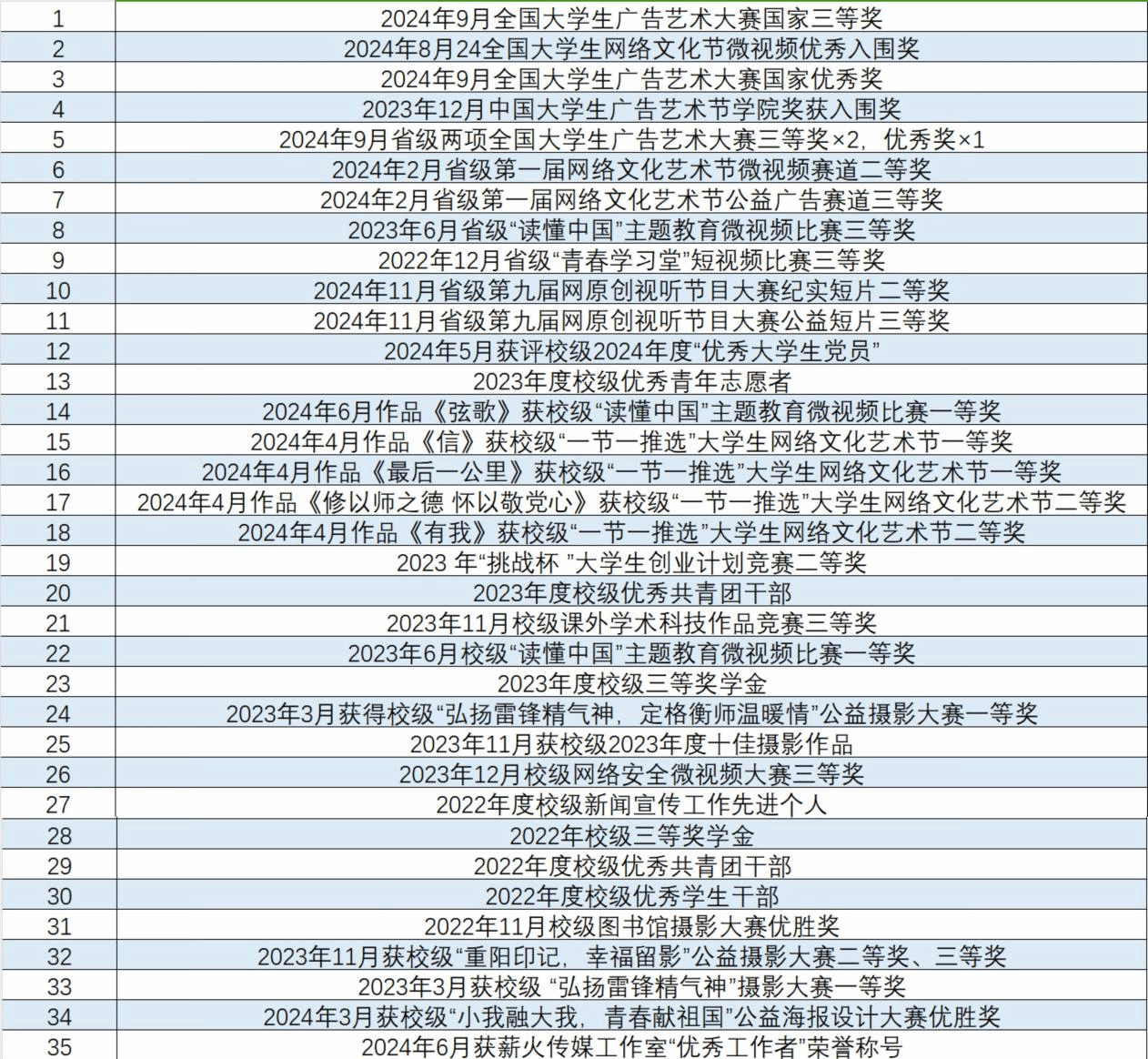 曾获校级“优秀大学生党员”、“优秀青年志愿者”、“优秀共青团干部”、大学生广告艺术大赛国家三等奖、全国大学生网络文化节微视频国家优秀入围奖等国家级荣誉4项、省级荣誉8项、校级荣誉25项。
