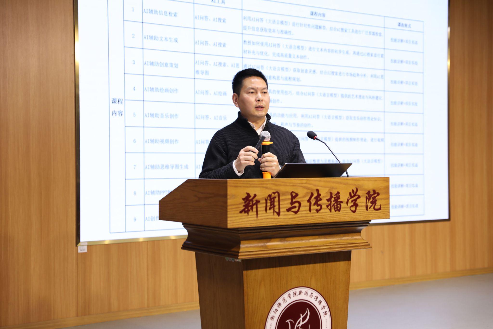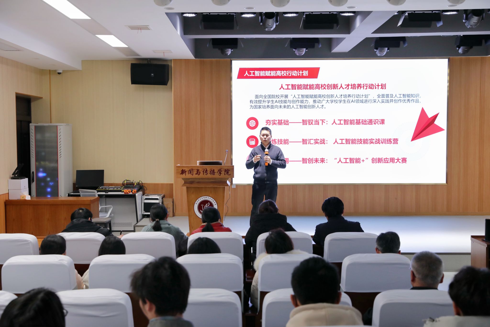 彭军辉院长主持讲座,他指出,当前科技发展日新月异,人工智能的浪潮正席卷各个行业,新闻传播领域也深受其影响,正经历着前所未有的变革。我们身处这样的时代,既是机遇也是挑战。新闻传播行业对人才的要求越来越高,不仅要具备扎实的专业基础,更要紧跟时代步伐,掌握前沿技术。