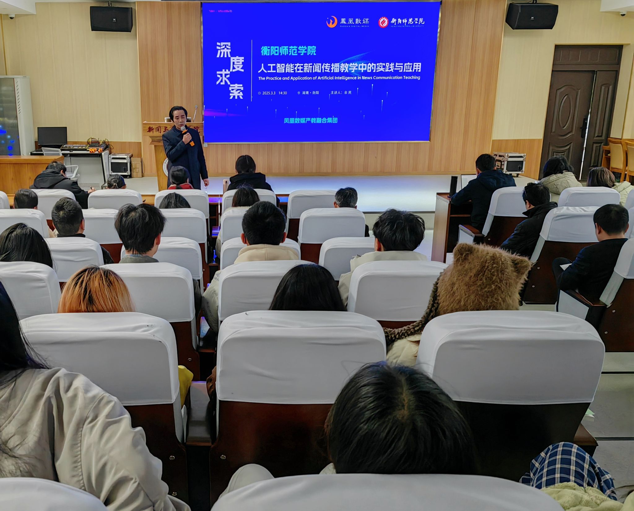 2025年3月3日下午,凤凰数媒产教集团资深项目负责人余民应邀在文A107举办了一场主题为“人工智能在新闻传播教学中的实践与应用”的专题讲座,365英国上市集团全体教师和2022级部分学生到场倾听。
