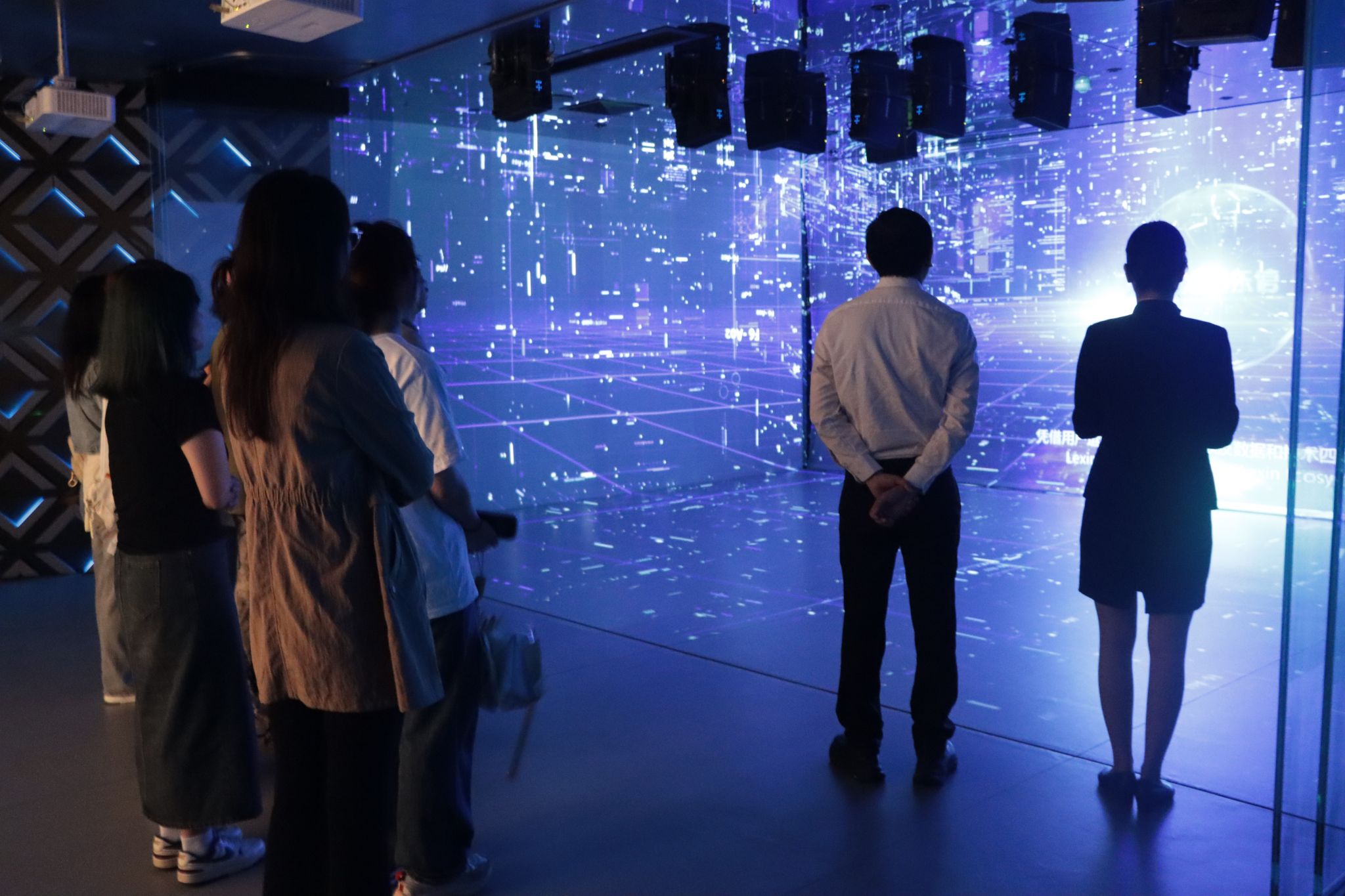 在乐信工作人员的引导下,我们走进充满科技感的展厅,通过动态演示大屏直观感受乐信在智能风控、消费金融、数字科技等领域的创新成果。屏幕实时跳动的数据与可视化案例,生动展现了乐信如何通过AI技术实现精准用户服务,以及其在“金融+科技+场景”生态中的核心布局。同学们对乐信的数字化运营体系发出阵阵惊叹,纷纷用手机记录下这一前沿科技的应用场景。