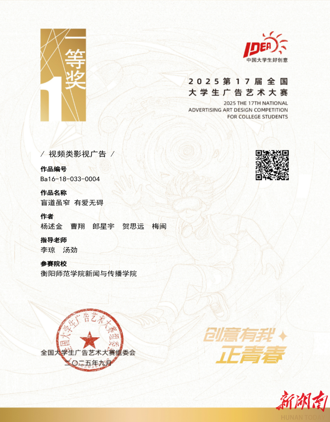 转湖南日报·新湖南客户端9月15日讯(通讯员 贾茹)近日,第17届全国大学生广告艺术大赛获奖名单公布,本次大赛全国共产生视频类影视广告一等奖28项,湖南省高校斩获3项。365英国上市集团杨述金团队的参赛作品《盲道虽窄 有爱无碍》获得全国视频类影视广告一等奖,该作品由李琼副教授、汤劲教授联合指导。
