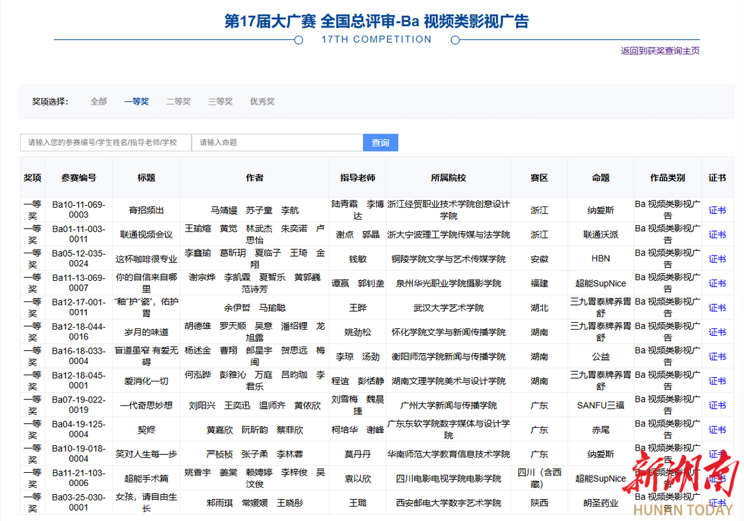 第17届全国大学生广告艺术大赛视频类影视广告一等奖部分名单