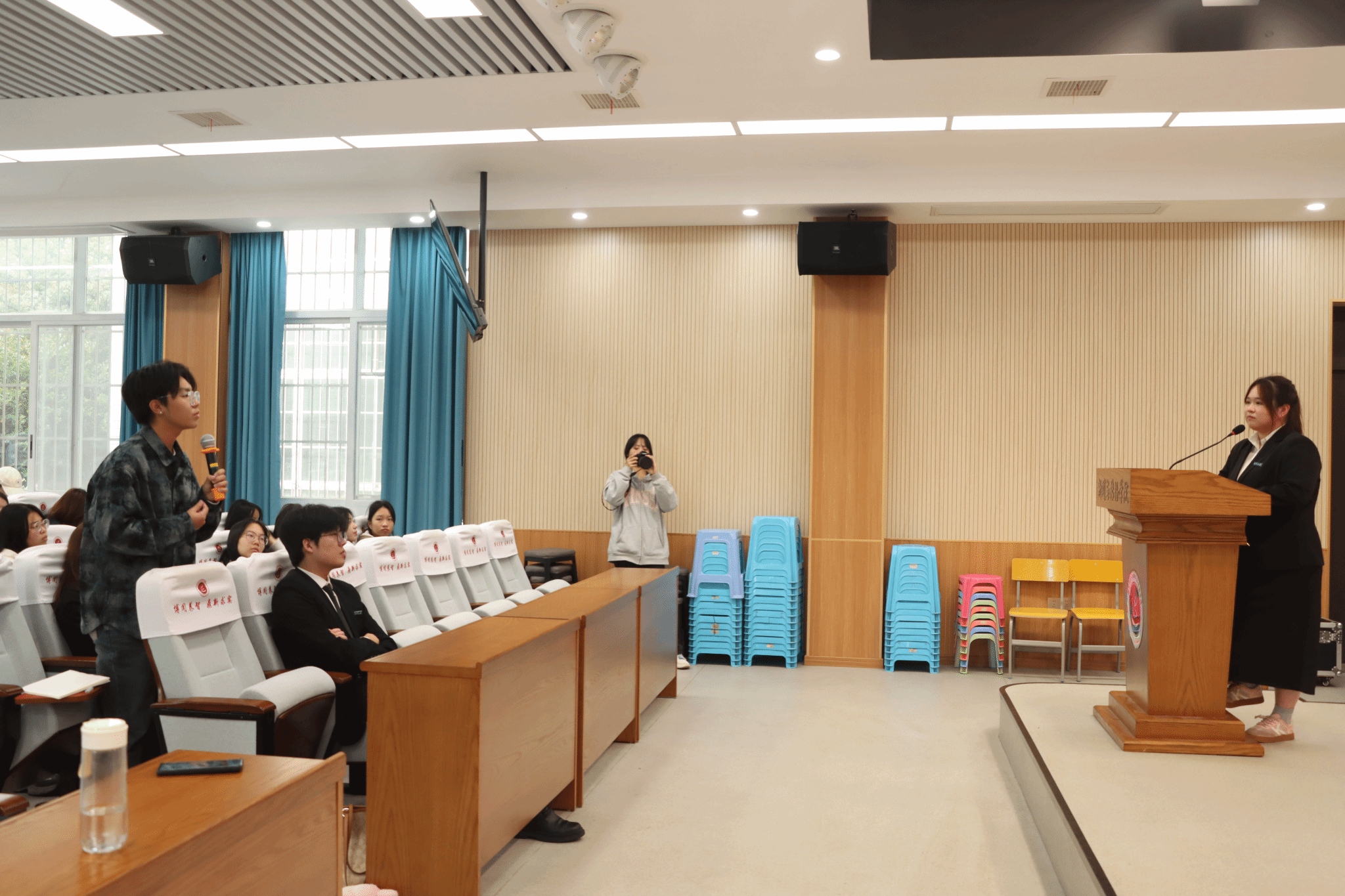 在互动提问环节,现场气氛热烈。2025级网络与新媒体一班的宋文鑫同学提问:如何高效推进团队分工协作?朱杏芬说道,高效协作需要负责人具备全局把控能力和“兜底能力”,团队成员则需明确分工、加强磨合,才能确保所有环节围绕核心顺利推进。