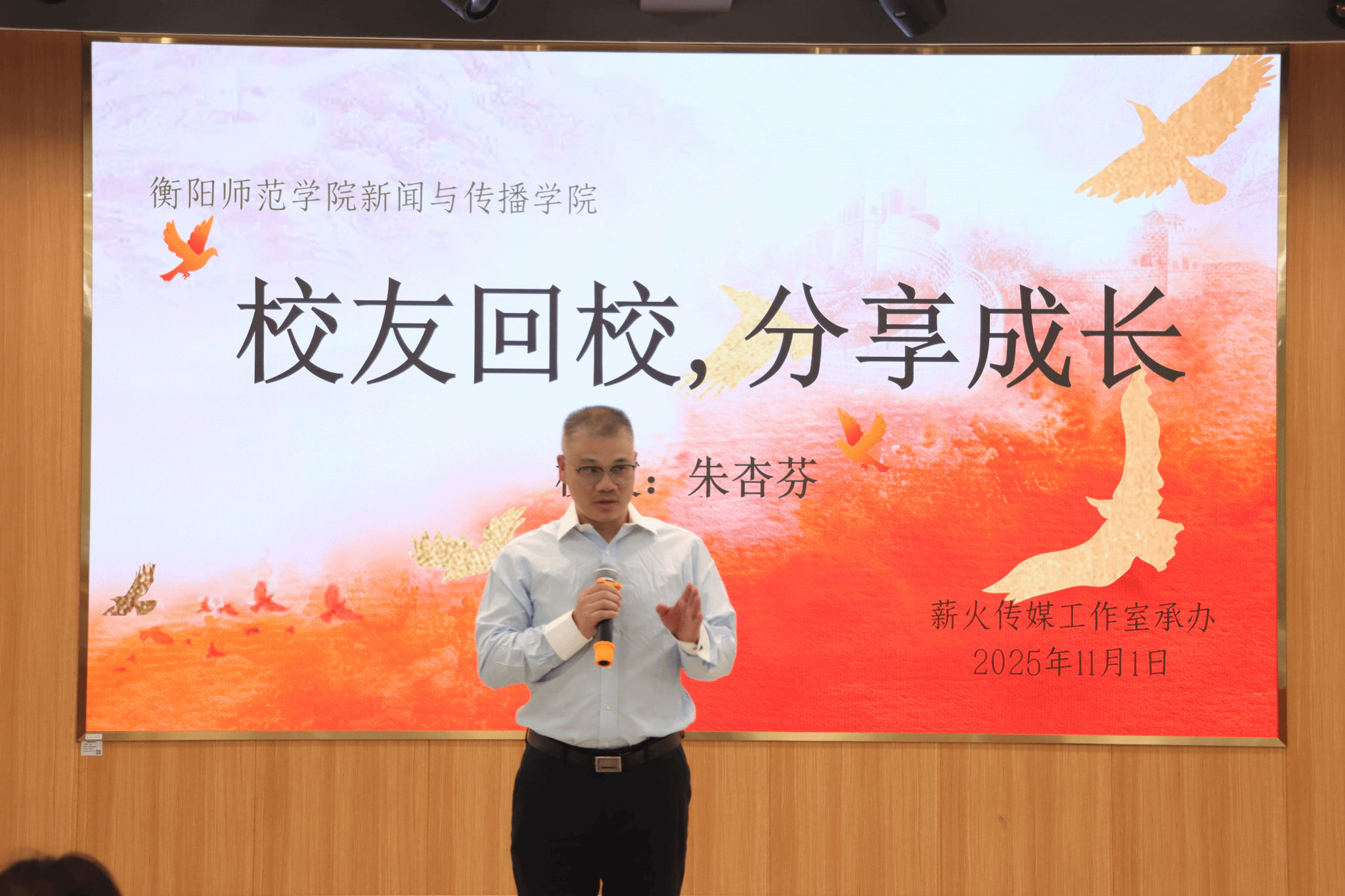 在创业方面,朱杏芬结合自身新传专业优势与实践经验,开启了创业尝试——创办以婚礼拍摄为主业的摄影工作室。她表示,在薪火传媒工作室锻炼的沟通能力,让她能高效对接客户需求,提供更贴心的服务。凭借专业的摄影技术与优质的沟通服务,摄影工作室一步一步、稳扎稳打,积累了良好口碑并且逐步扩大团队规模。她在分享中多次强调,“扎实的专业技能是创业成功的底气”。