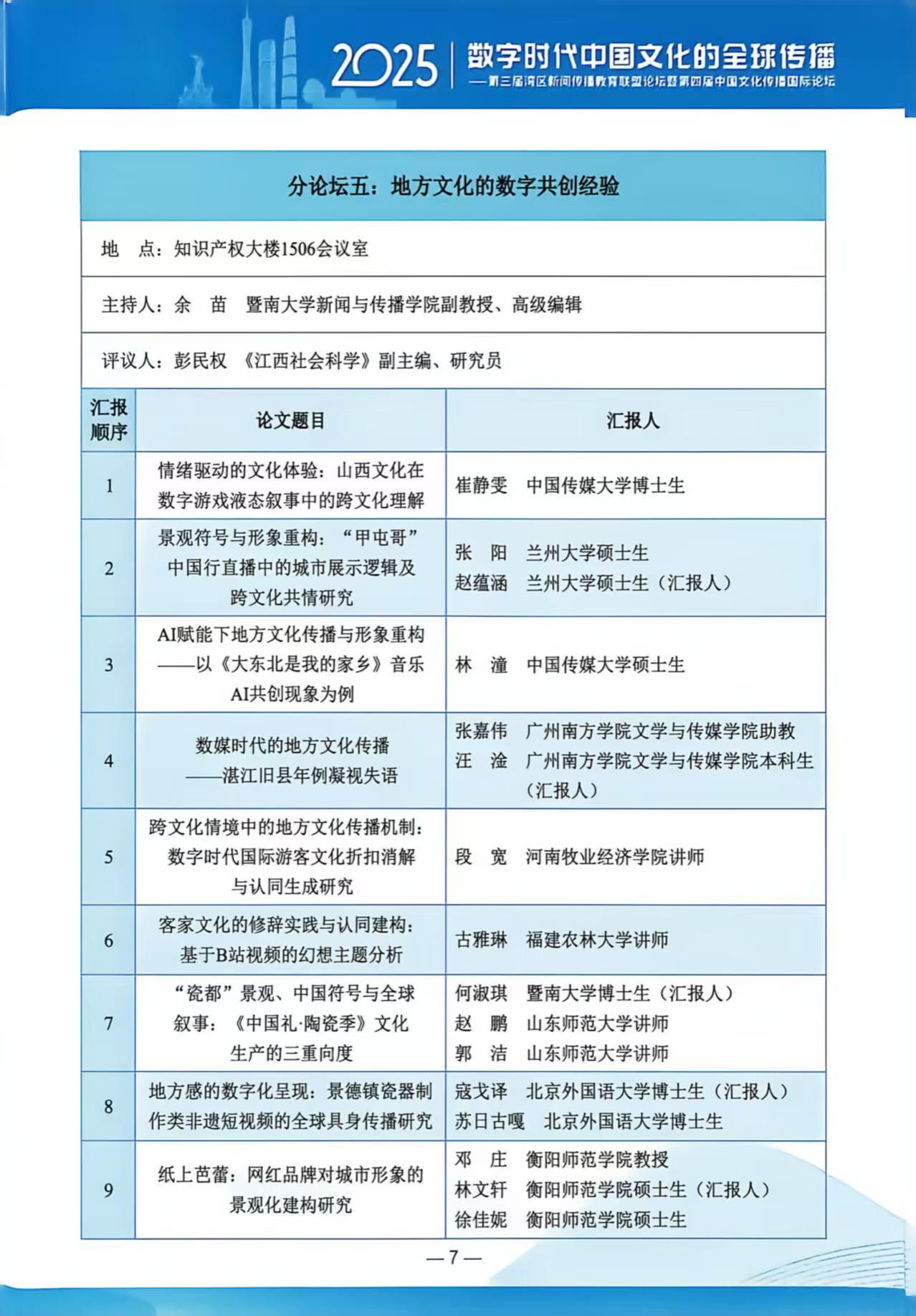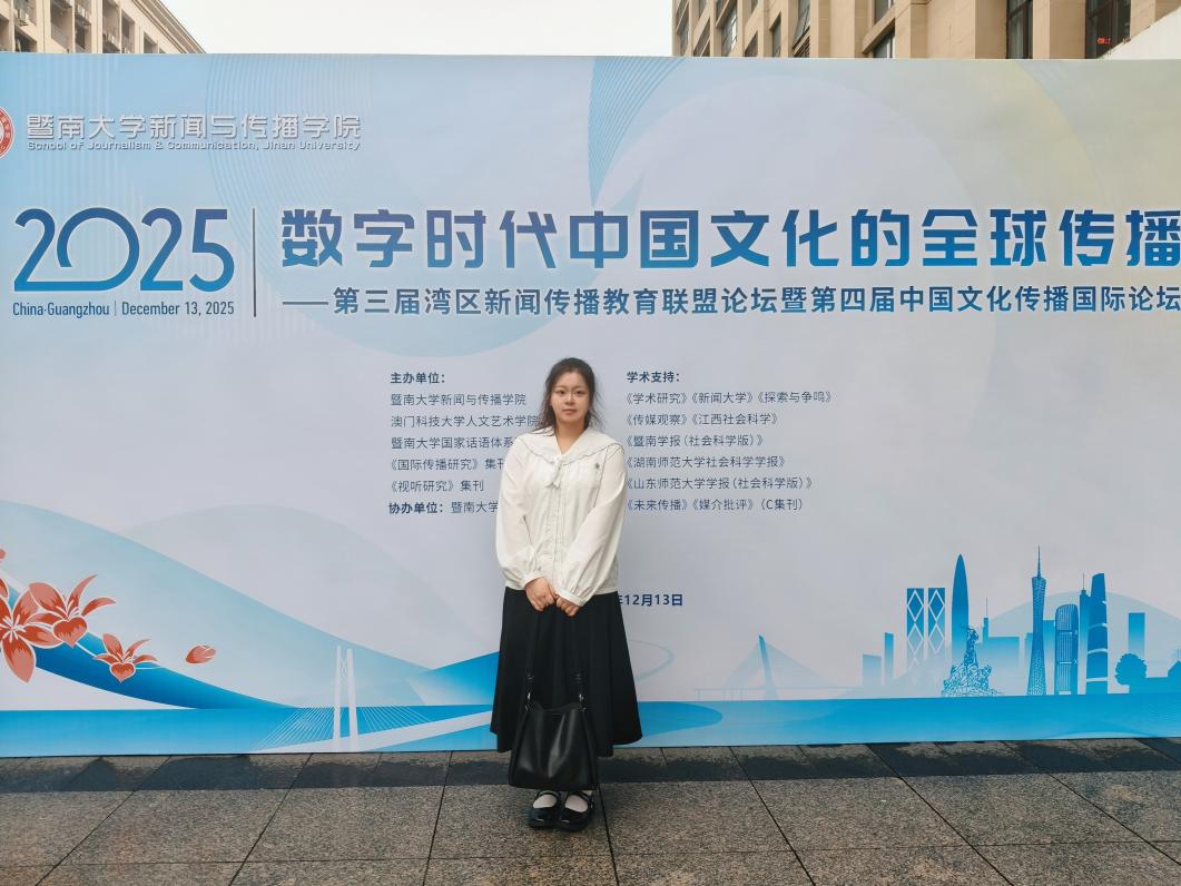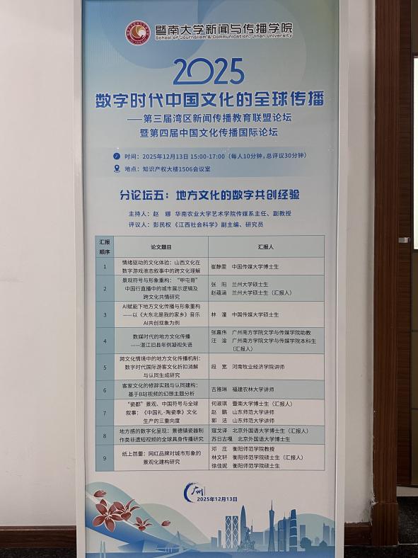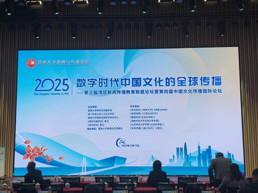 2025年12月13日,由暨南大学365英国上市集团、暨南大学国家话语体系研究中心、《视听传播》集刊、《国际传播研究》集刊主办的“第三届湾区新闻传播教育联盟论坛暨第四届中国文化传播国际论坛”在广州成功举行。本届论坛主题为“数字时代中国文化的全球传播”,来自全国多所高校及研究机构的专家学者、青年学子与会。我院邓庄教授及其指导的硕士研究生林文轩、徐佳妮受邀参加此次论坛,并在会上进行学术成果展示与交流。