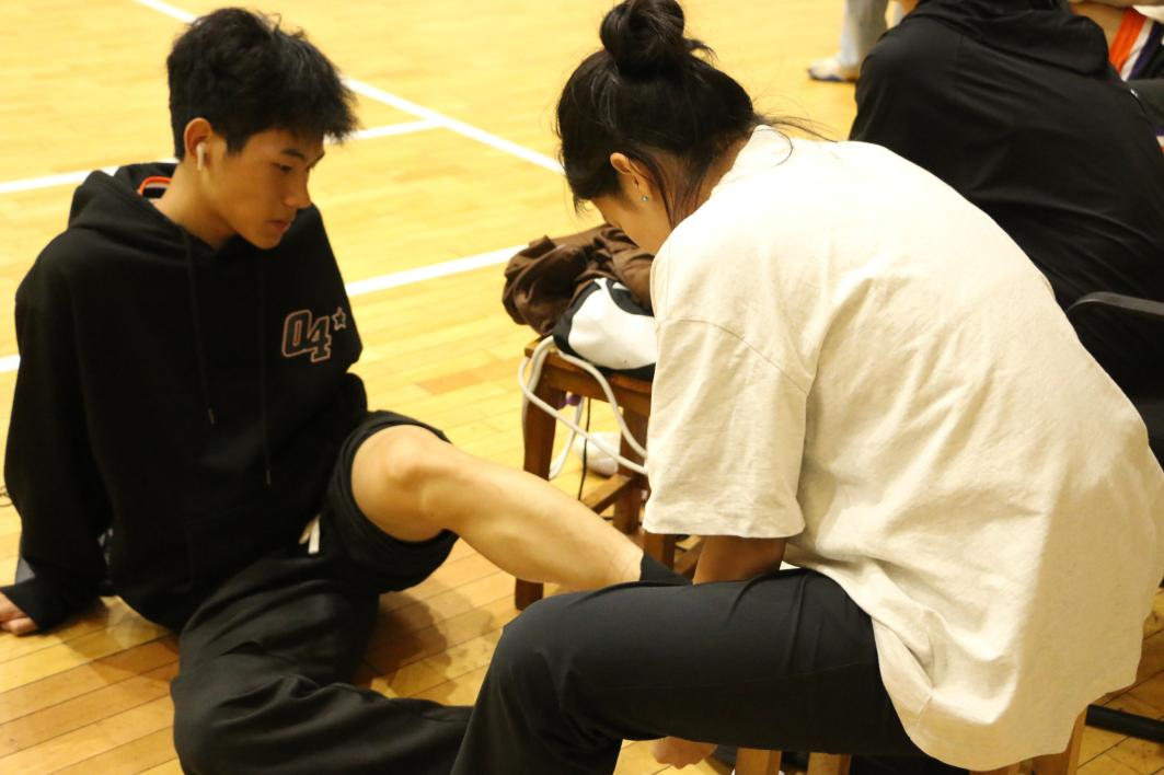 赛前,教练员帮队员贴上肌贴,尽可能减少比赛过程中球员受伤的风险,确保球员的身体健康安全,为接下来的每一场比赛提供安全保障。