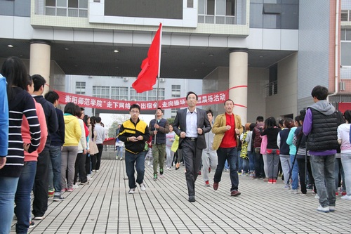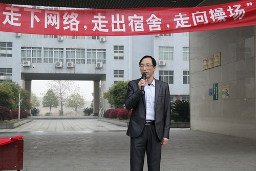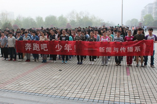 首先由邓玉久书记致辞。“Good morning,少年们”一句颇具幽默的开场白唤醒了那些还没有真正“起床”的同学们。邓书记用“少年强则中国强”、“文明其精神,野蛮其体魄”、“奔跑吧,少年”三句话阐述了“走下网络、走出宿舍、走向操场”主题晨练活动的意义和基本思路,号召全系师生积极参加主题晨练活动,锻炼好身体,强健自身体魄,全面提升我系师生的精神风貌。最后由新闻系第十二届团学分会主席席国栋宣布新闻与传播系“走下网络、走出宿舍、走向操场” 主题晨练活动正式启动。