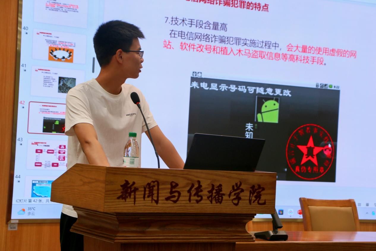 最后,刘老师重点阐释了电信诈骗的相关内容,包括其特点、作案流程、常见类型及侦控途径等,要警惕刷单返利、冒充客服等12类诈骗,并通过6个典型案例的讲解分析提醒同学们增强防范意识,确保自身安全。