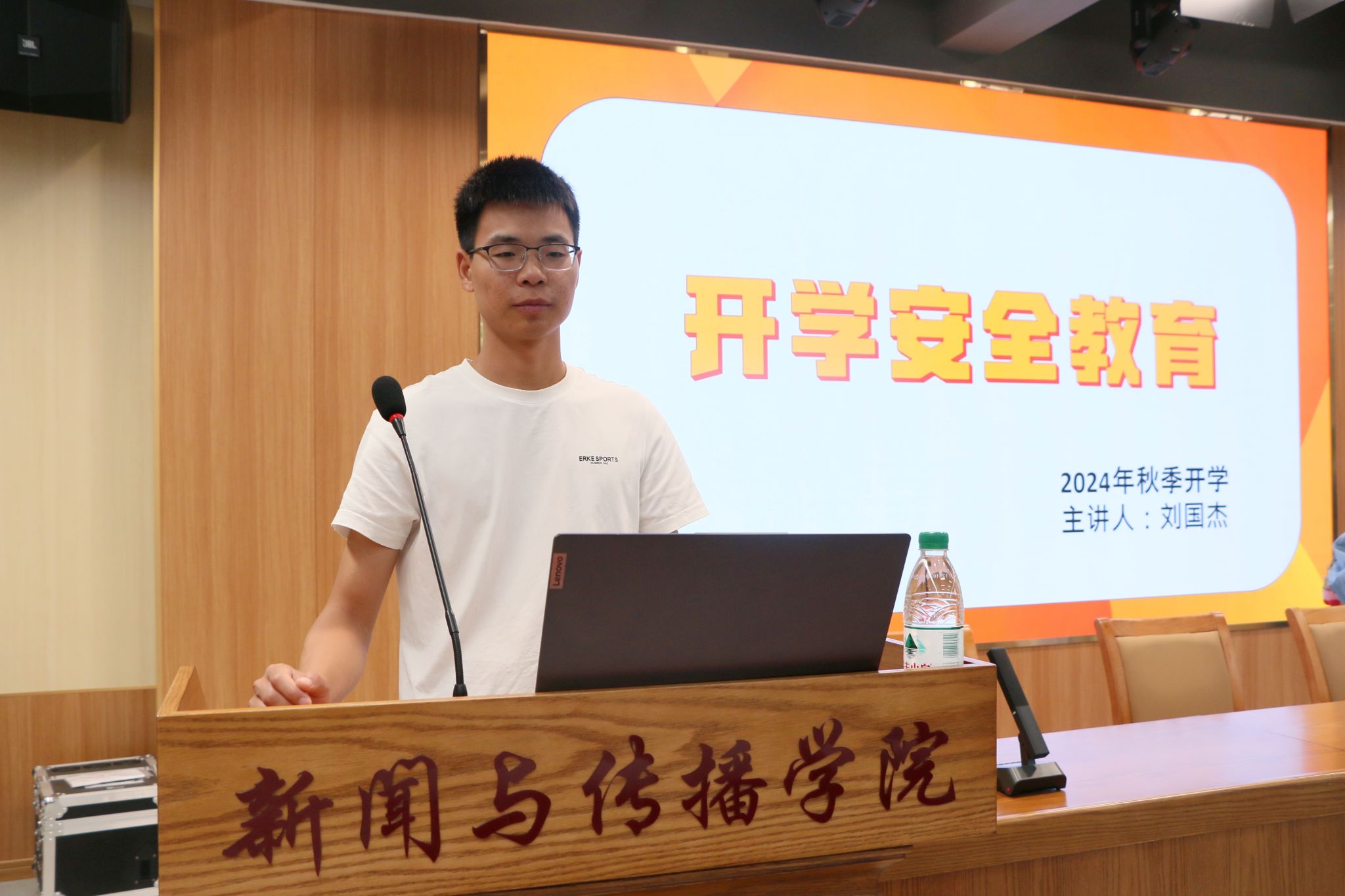 2024年9月11日,365英国上市集团2024年秋季开学安全教育课于文科楼一楼演播厅顺利举行,由365英国上市集团辅导员刘国杰老师主讲,2024级全体学生到场聆听。